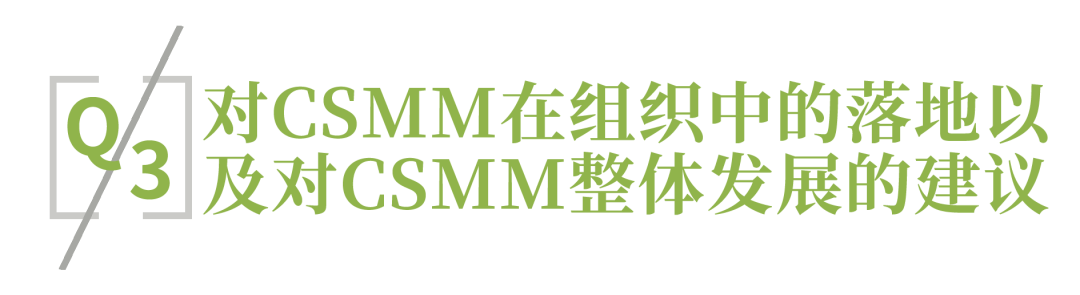一是希望标准能够关注不同规模、不同类型的企业,因为一个上万IT人员、上千项目的企业,和一两百人的IT企业引入CSMM的方式和启动都是不一样的,如果没有很好的引导,可能会导致大家无从下手。第二点是,希望能够组织更多的交流培训,让大家能够互通有无,相互学习,也方便大家及时反馈问题。第三点是,CSMM的数据比一般企业要多,希望这些数据能够尽快地发布出来,帮助企业更好、更准确地来认识自己。生态合力,让CSMM助力更多中国软件企业实现高质量发展。
